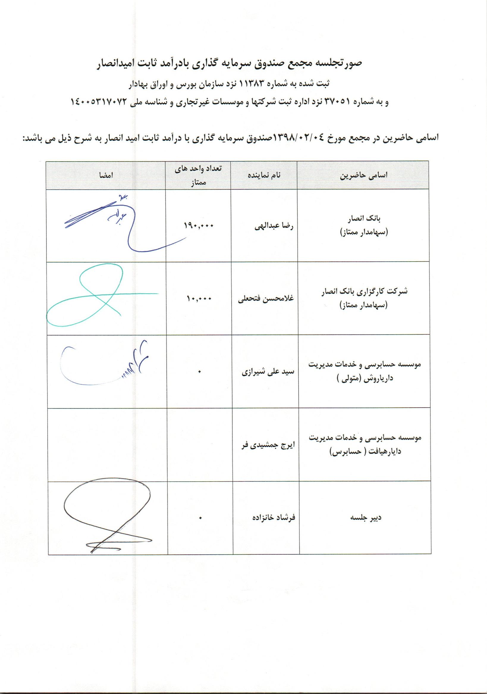 تصمیمات مجمع صندوق سرمایه گذاری با درآمد ثابت امید انصار مورخ 1397/11/28 (تغییر رکن متولی صندوق)
