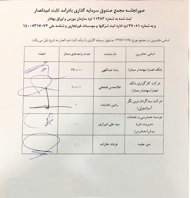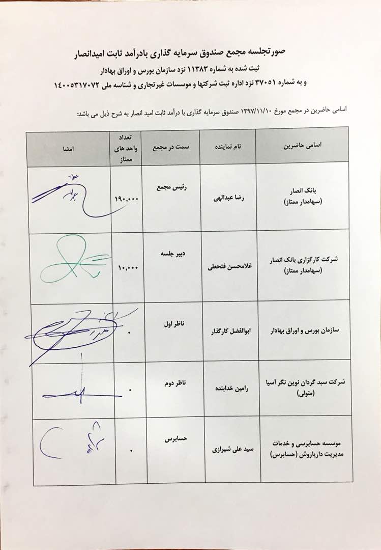 صورتجلسه مجمع موسس صندوق سرمایه گذاری با درآمد ثابت امید انصار مورخ۱۳۹۴/۰۶/۱۶
